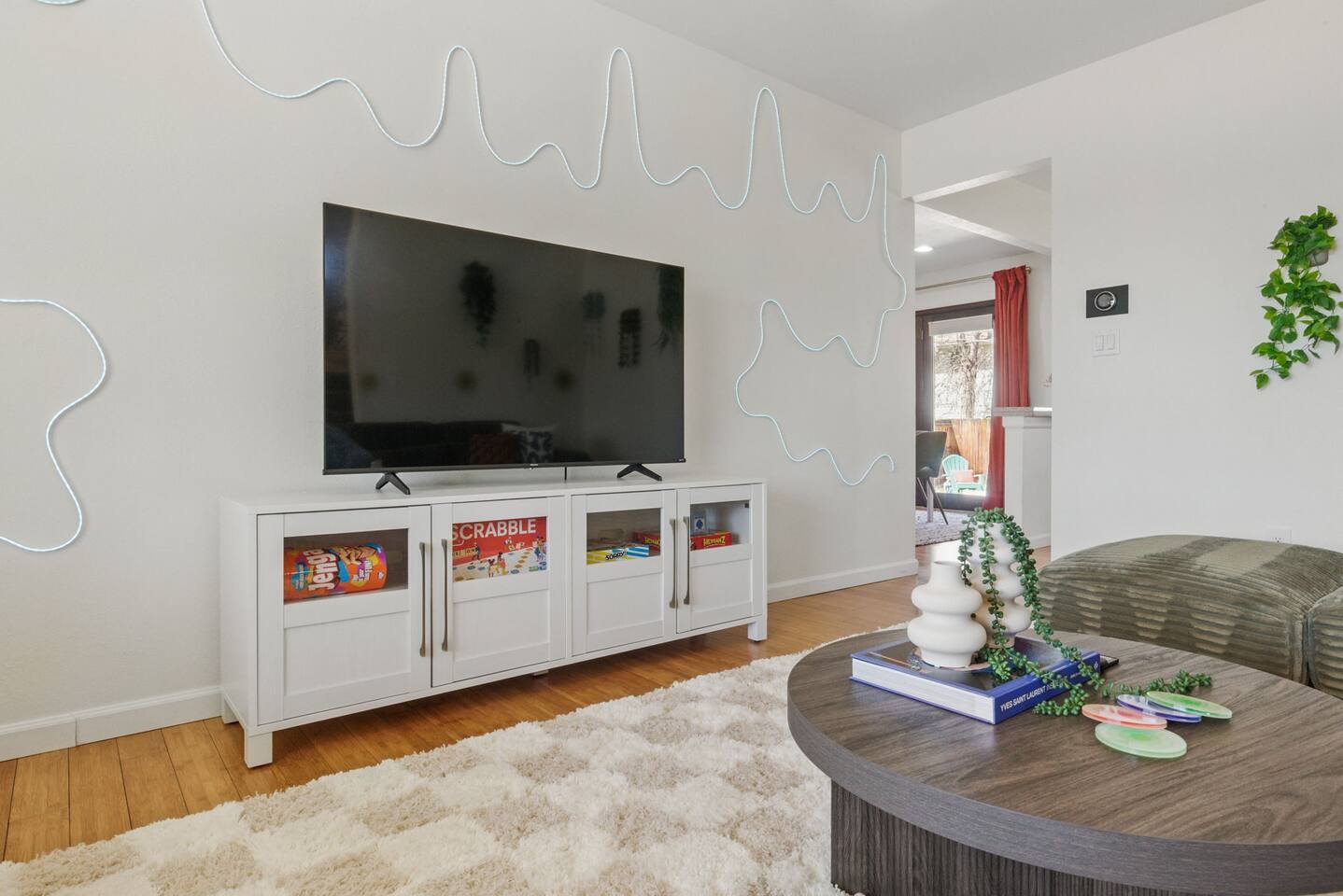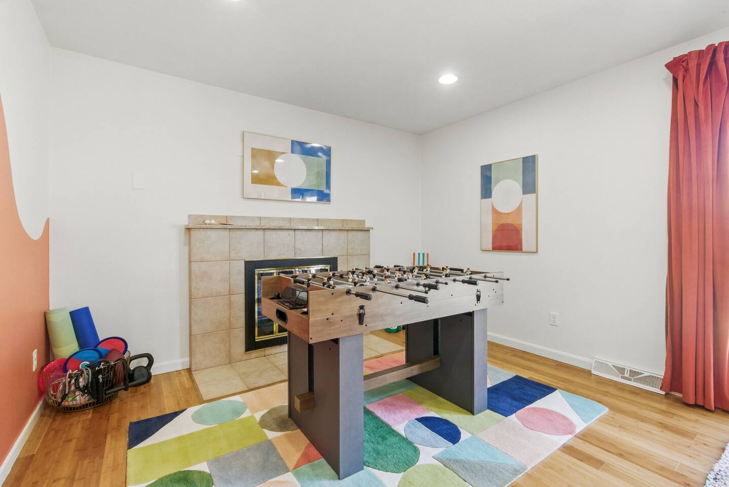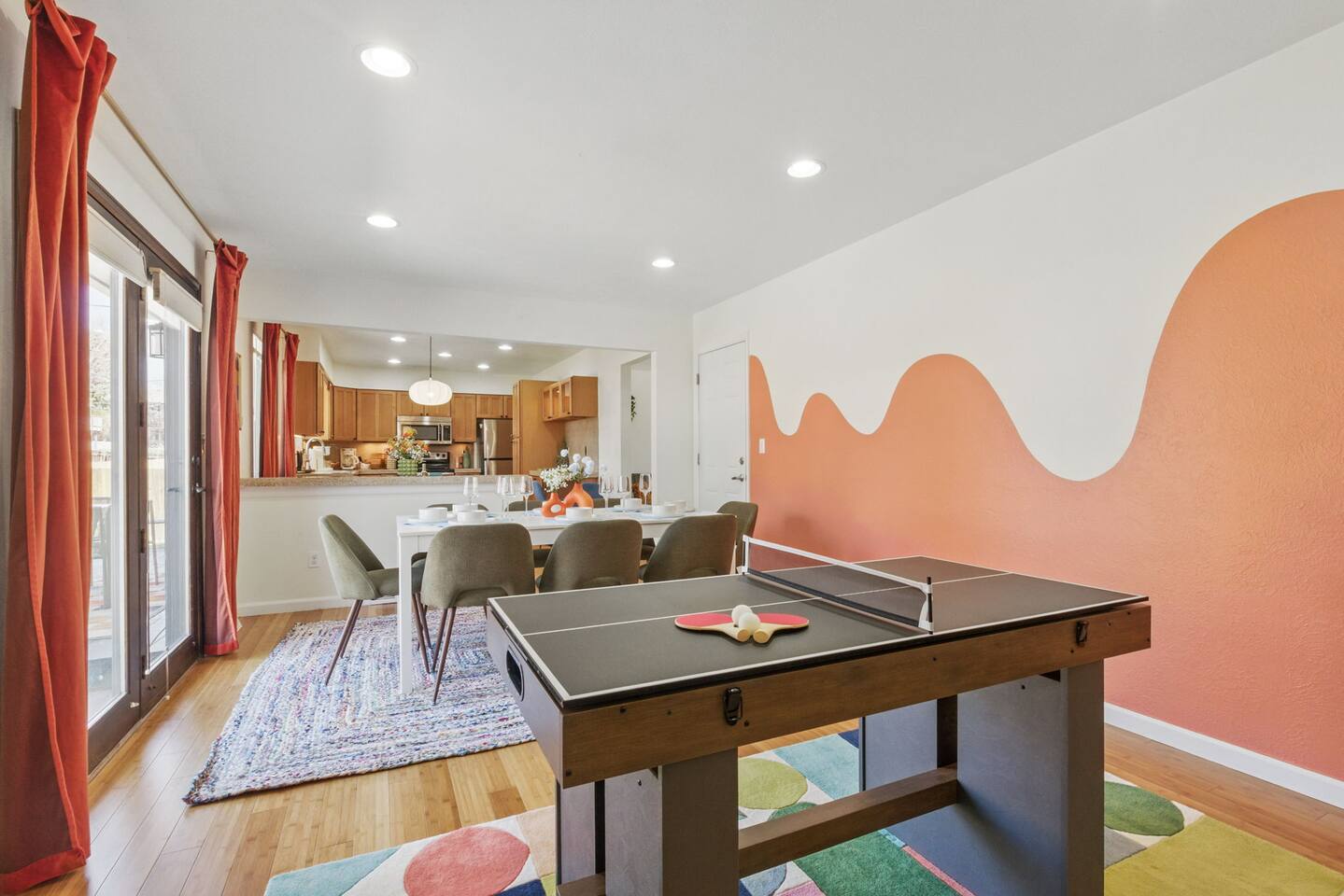 ★ Living Room ★ ✧ Modular couch perfect for lounging ✧ Two stylish Cloud chairs for added comfort ✧ Ceiling fan to keep things cool ✧ The first area you'll see when you enter the house ✧ Board games for a fun, casual evening ✧ TV for streaming your favorite shows and movies ★ Dining Area ★ ✧ Elegant dining table with 8 shell chairs ✧ Coral pop-up color for a vibrant table setup ✧ Sliding door that opens up to a beautiful backyard view ✧ Vented fireplace for a cozy atmosphere ★ Full Kitchen ★ ✧ Fully equipped with modern appliances ✧ Ample storage space for all your cooking needs ✧ Dedicated coffee station for your morning brew ✧ Mini bar with seating for 2 ✧ Stovetop with range hood for effortless cooking ✧ Kitchen nook with 4 seats for casual meals ✧ Highchair for your toddler's convenience ✧ Conveniently located near the dining area ★ Bedrooms ★ ✧ 4 cozy bedrooms for a restful stay ✧ Master bedroom with a queen bed, dedicated workspace, and closet with built-in ironing board ✧ Bedrooms 2 & 3, each with a queen bed and closet, sharing a bathroom just outside their doors ✧ Bedroom 4 with a double bed and closet ★ Game Room in the Dining Area ★ ✧ A portable 3-in-1 multigame table (foosball, ping pong & air hockey) for endless fun ✧ Exercise equipment for keeping active ✧ Outdoor game equipment for even more entertainment ★ Bathrooms ★ ✧ 2 full bathrooms for convenience ✧ Bathroom 1: Built-in bathtub within the shower ✧ Bathroom 2: Walk-in shower ✧ Towels and hygiene essentials provided for your comfort ★ Outdoor ★ ✧ 2-burner stainless steel gas grill for outdoor cooking ✧ Patio with outdoor dining table and seating for 8 people ✧ Table setting for al fresco meals ✧ Putting green for some fun outdoor activity ✧ Cornhole for friendly competition ✧ Large Connect 4 game for some nostalgic fun ✧ Adirondack chairs arranged around a firepit for cozy nights ★ Other Areas ★ ✧ Free parking on the premises ✧ Laundry room with washer and dryer ✧ Front porch with 2 deck chairs and a mini table for relaxing