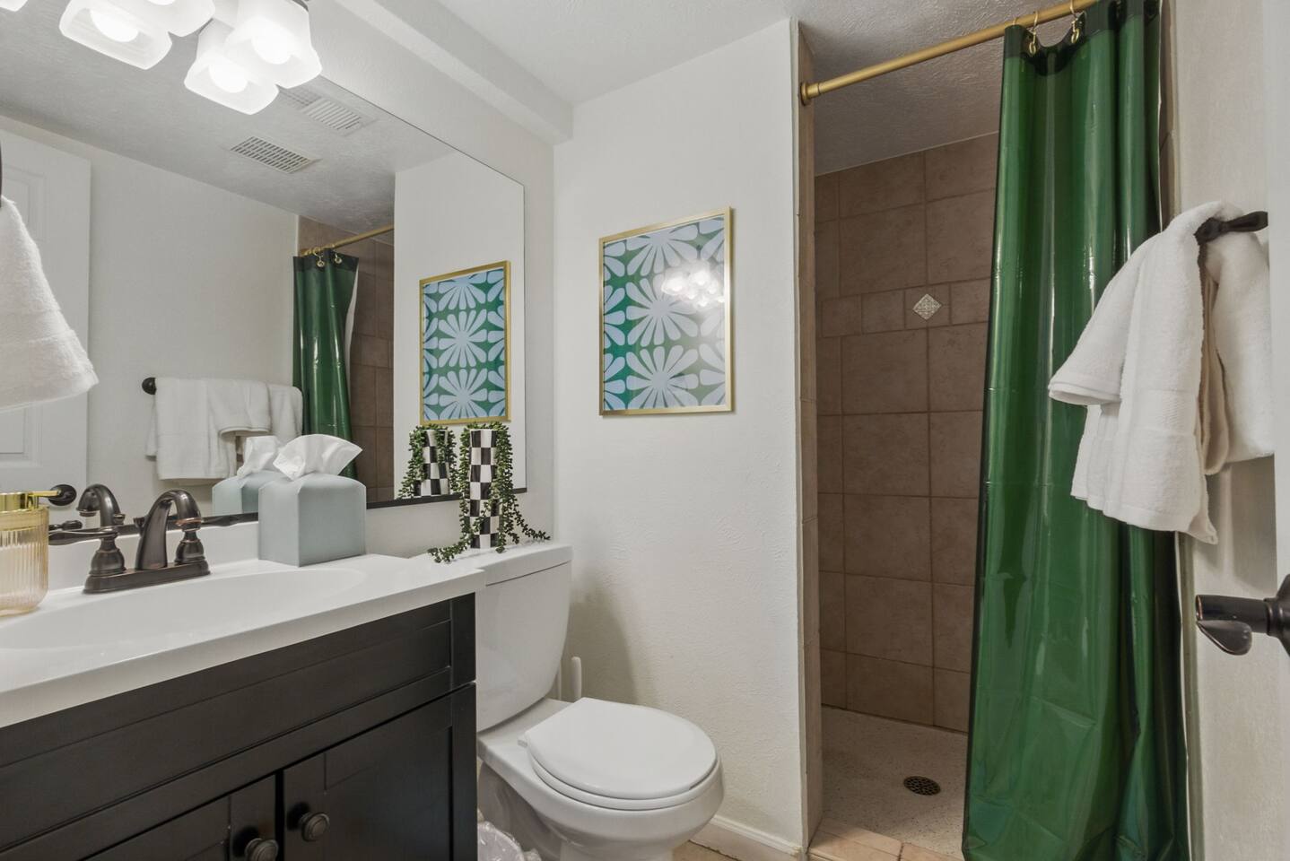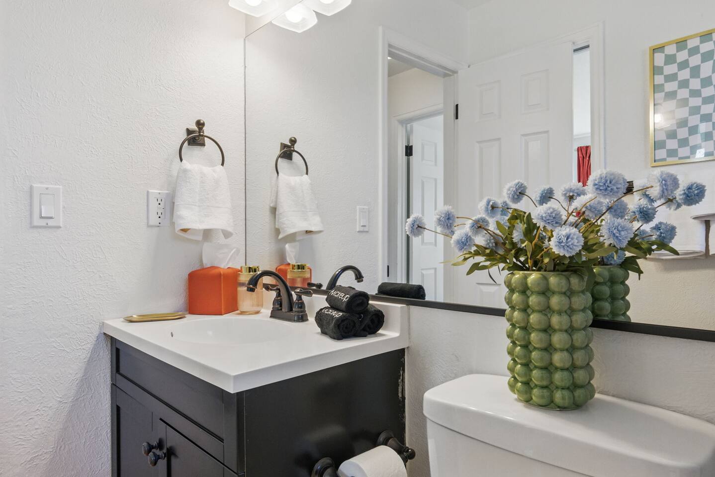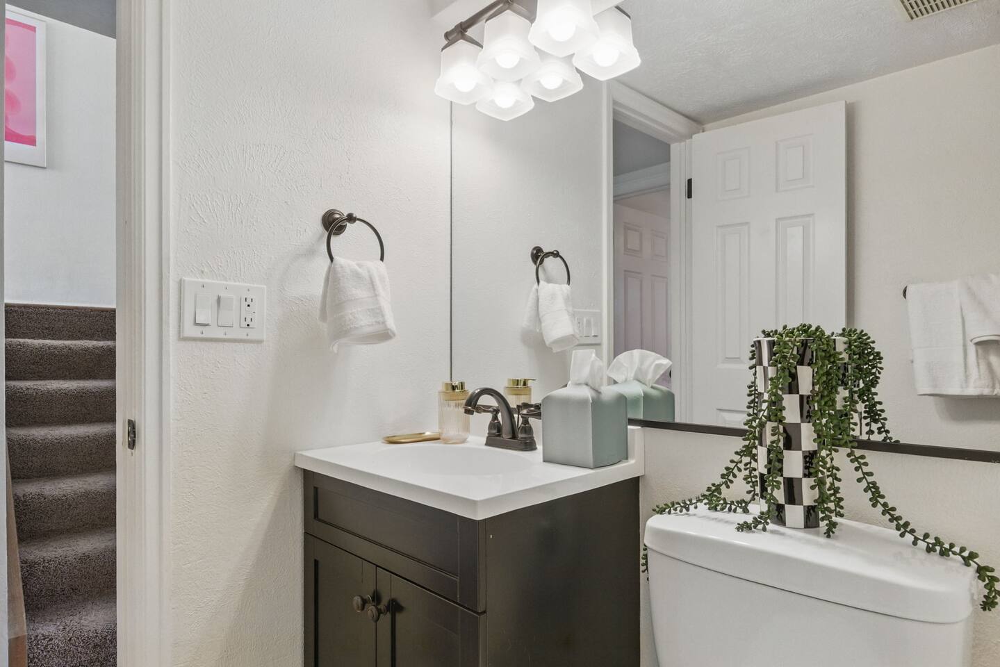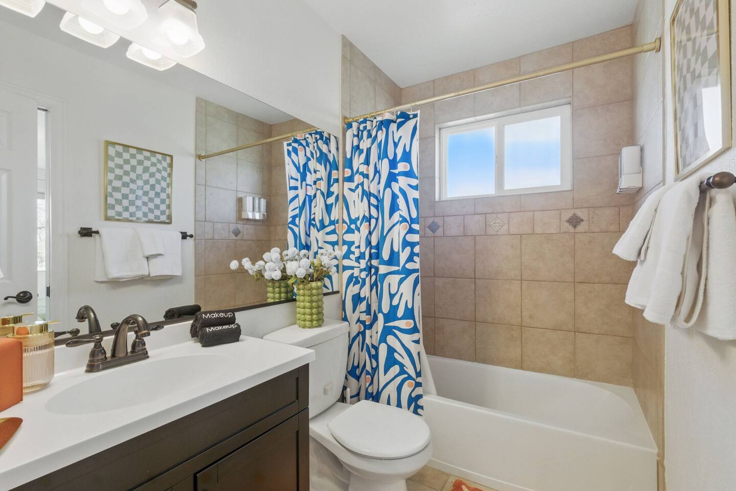 ★ Living Room ★ ✧ Modular couch perfect for lounging ✧ Two stylish Cloud chairs for added comfort ✧ Ceiling fan to keep things cool ✧ The first area you'll see when you enter the house ✧ Board games for a fun, casual evening ✧ TV for streaming your favorite shows and movies ★ Dining Area ★ ✧ Elegant dining table with 8 shell chairs ✧ Coral pop-up color for a vibrant table setup ✧ Sliding door that opens up to a beautiful backyard view ✧ Vented fireplace for a cozy atmosphere ★ Full Kitchen ★ ✧ Fully equipped with modern appliances ✧ Ample storage space for all your cooking needs ✧ Dedicated coffee station for your morning brew ✧ Mini bar with seating for 2 ✧ Stovetop with range hood for effortless cooking ✧ Kitchen nook with 4 seats for casual meals ✧ Highchair for your toddler's convenience ✧ Conveniently located near the dining area ★ Bedrooms ★ ✧ 4 cozy bedrooms for a restful stay ✧ Master bedroom with a queen bed, dedicated workspace, and closet with built-in ironing board ✧ Bedrooms 2 & 3, each with a queen bed and closet, sharing a bathroom just outside their doors ✧ Bedroom 4 with a double bed and closet ★ Game Room in the Dining Area ★ ✧ A portable 3-in-1 multigame table (foosball, ping pong & air hockey) for endless fun ✧ Exercise equipment for keeping active ✧ Outdoor game equipment for even more entertainment ★ Bathrooms ★ ✧ 2 full bathrooms for convenience ✧ Bathroom 1: Built-in bathtub within the shower ✧ Bathroom 2: Walk-in shower ✧ Towels and hygiene essentials provided for your comfort ★ Outdoor ★ ✧ 2-burner stainless steel gas grill for outdoor cooking ✧ Patio with outdoor dining table and seating for 8 people ✧ Table setting for al fresco meals ✧ Putting green for some fun outdoor activity ✧ Cornhole for friendly competition ✧ Large Connect 4 game for some nostalgic fun ✧ Adirondack chairs arranged around a firepit for cozy nights ★ Other Areas ★ ✧ Free parking on the premises ✧ Laundry room with washer and dryer ✧ Front porch with 2 deck chairs and a mini table for relaxing
